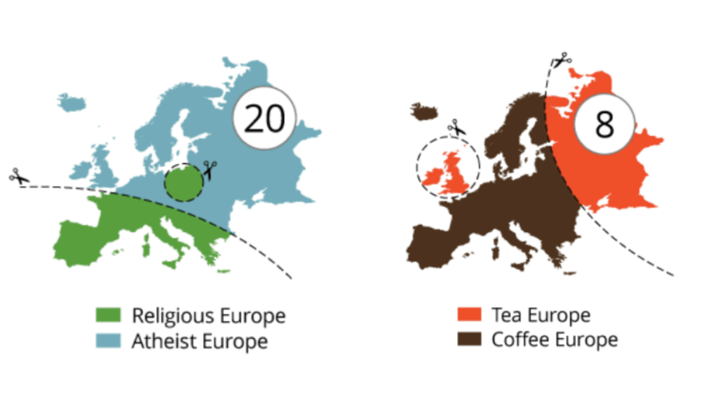 Yanko Tsvetkov is an artist who calls himself “a person living on Earth.” He’s also the person behind the Atlas of Prejudice, a collection of funny maps that show common ideas about Europe. He only needs a map of Europe, and then he draws lines on it to make different sections.